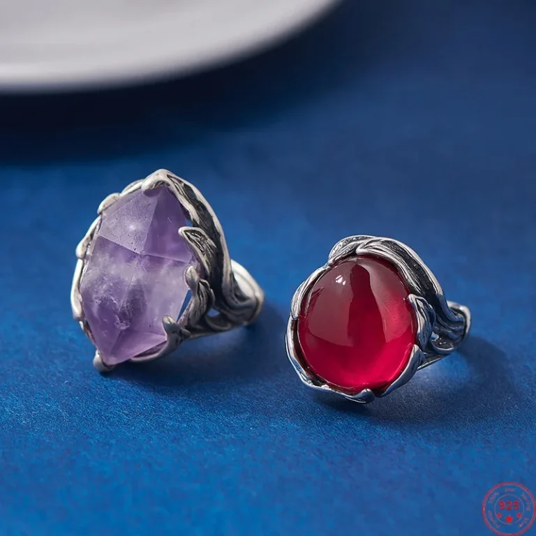 S925 Sterling Silver Charms Rings for Women New Fashion Retro Leaves Irregular Amethyst Oval Corundum Jewlery